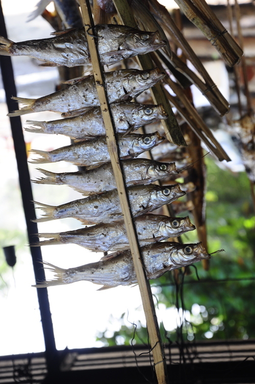 Ghé vào một cửa hàng cá nướng trên quốc lộ 6, bạn sẽ không khỏi háo hức với món cá ngon của vùng đất này. Cách chế biến món cá này khá đơn giản. Sau khi được làm sạch, cá được ngâm trong nước muối cho tự sạch ruột. Khi đem kẹp nướng, cá cũng được xát muối quanh thân và nướng trong nhiều giờ. Đặc biệt, cá nướng được đặt trên lá chuối xanh, ăn kèm với đinh lăng, lá sấu non, lá mơ và lá lốt, chấm với muối ớt xanh. Cá nướng thơm ngon, thịt chắc, da giòn, xém cạnh, mặn vừa đủ. Thịt cá ngọt chấm muối, cuộn trong lá lốt vừa làm mất vị tanh của cá vừa làm vị cá thêm đậm đà, càng ăn càng ngọt. Ngồi bên bếp lửa, hương thơm lừng của củi than, vị mặn mòi của muối cùng vị thơm của tre và cá khiến du khách khó lòng bỏ qua.