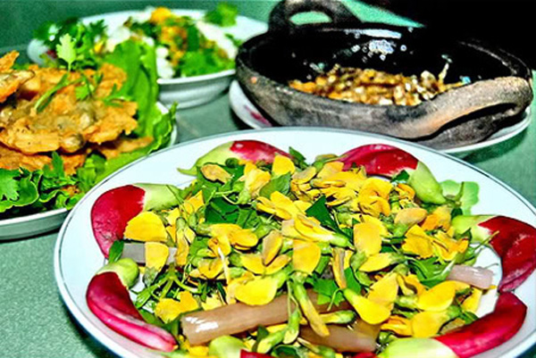 Cùng với các loại lá thì mắm thịt và nem thính được cuốn vào lá, vị cay cay nồng của lá tươi cộng với vị đậm của mắm thịt, vị khô của nem thính cho ta nhiều cảm giác lạ.